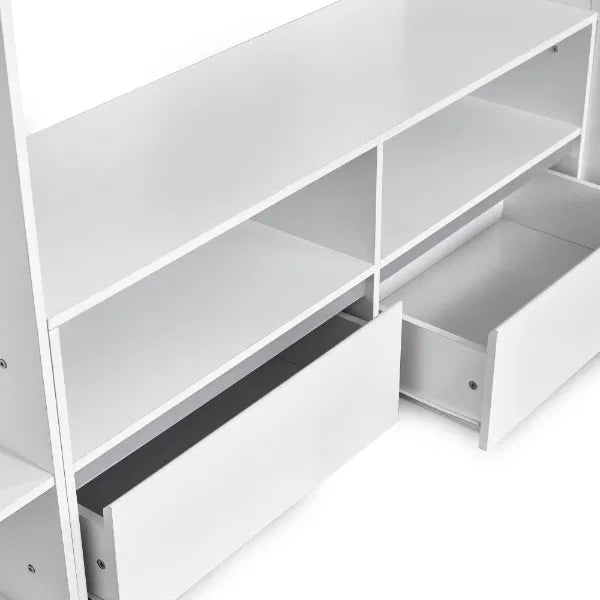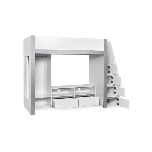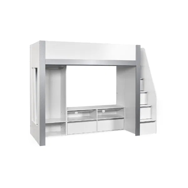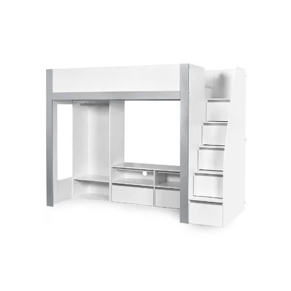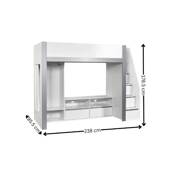 Make bedtime fun with this multi-functional high sleeper bed, thoughtfully designed to maximise every inch of space in your child’s room. With its elevated high rise bed design, it opens up the floor beneath for a full-width wardrobe, versatile open shelving and a dedicated space to fit a TV frame or entertainment unit. It blends modern style with everyday functionality, offering multiple storage compartments for clothing, books, toys, and media devices. Even the sturdy fixed ladder doubles as practical storage, with built-in compartments perfect for display or daily essentials. Finished in a sleek white and silver colourway and crafted from durable wood, this loft bed is a smart and stylish solution for growing children. Mattress and TV sold separately.