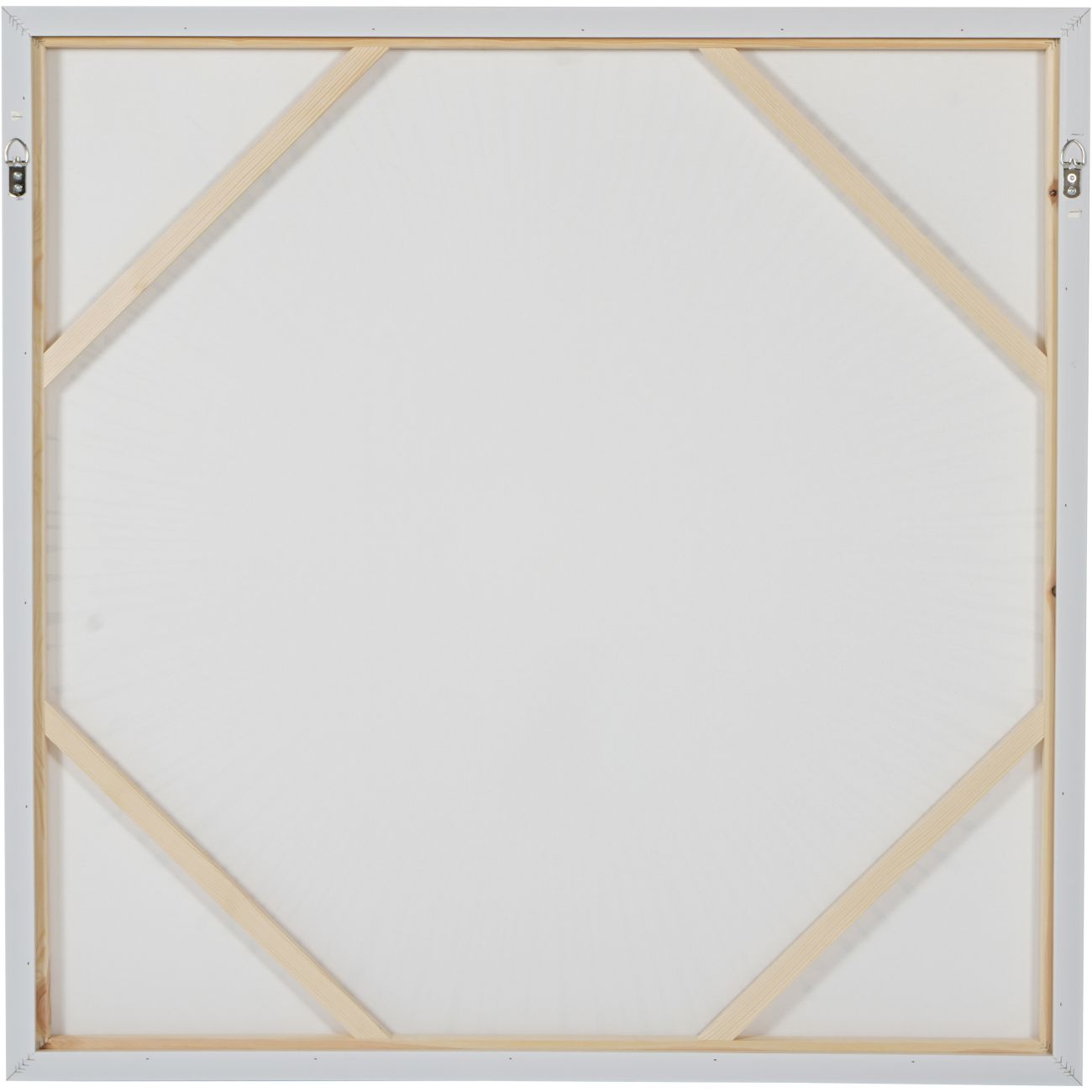 Framed Canvas measuring 100cm x 100cm and featuring an abstract solar symbol with gold foil finishing. The canvas is framed with a white wood effect frame. It hangs this way up only, on two integral hooks. Wall fixtures not included. Hand finished to ensure variations in foiling finish occur.