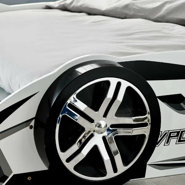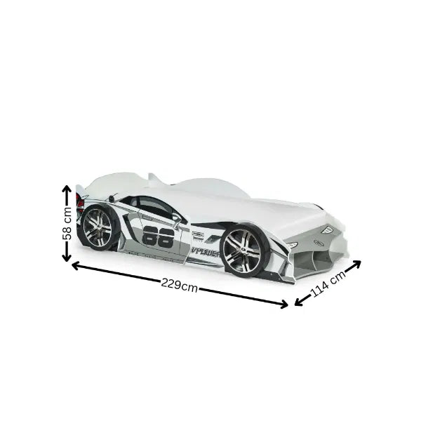 Make bedtime an adventure with this race car bed, designed to fuel imagination and excitement. Styled with sleek, sporty detailing and a high-gloss finish, it captures the thrill of the racetrack. The sturdy bed frame is designed with safety in mind, while the low sleeper style makes it easy for little ones to hop in and out on their own. With all the fun of a themed bed and the practicality of a cabin bed, it’s a playful yet functional choice for any child’s room. Adjustable base fits both UK and European single mattresses. Mattress sold separately.